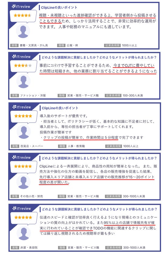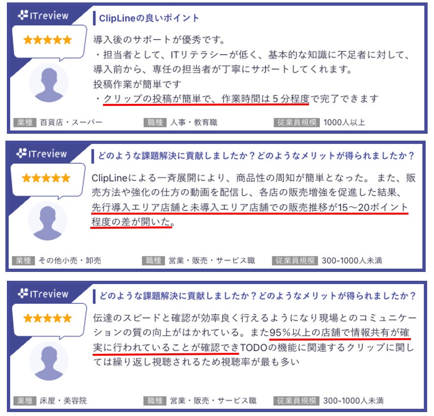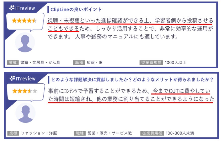 多店舗展開ビジネスの組織実行力を高める動画マネジメントシステム「ClipLine(クリップライン)」を提供するClipLine株式会社(本社:東京都品川区、代表取締役社長:高橋 勇人、以下「当社」)は、このたびアイティクラウド株式会社(本社:東京都港区、代表取締役社長:黒野 源太)が運営するIT製品レビュープラットフォーム「ITreview(アイティレビュー)」2022年10~12月期間において、最高位の「リーダー」に2部門で、平均値以上の「ハイパフォーマー」に3部門で認定され、顧客満足度は4.5を獲得したことをお知らせします。