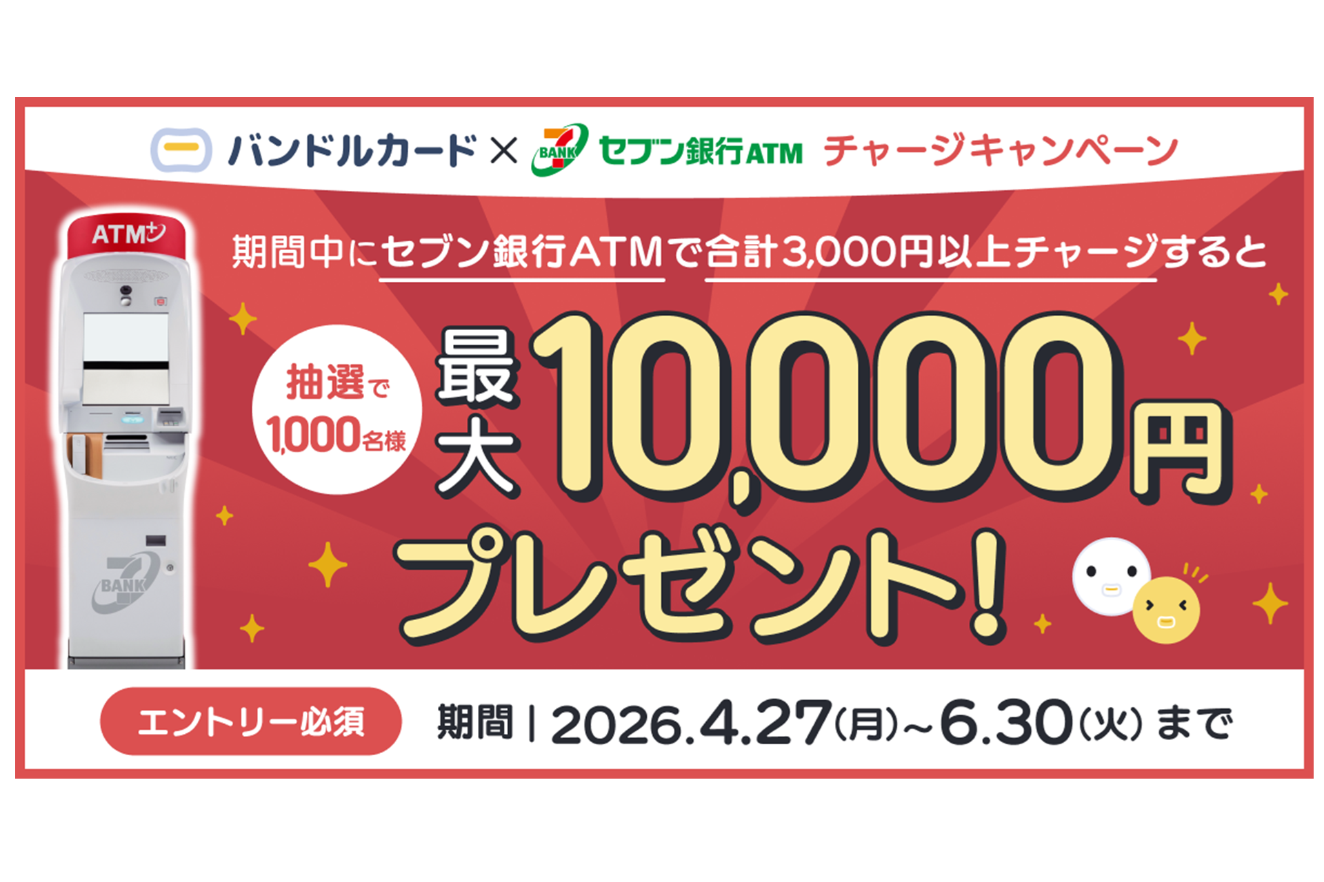 セブン銀行ATMチャージをご利用のみなさまは、忘れずにエントリーして、バンドルカードをご利用ください。