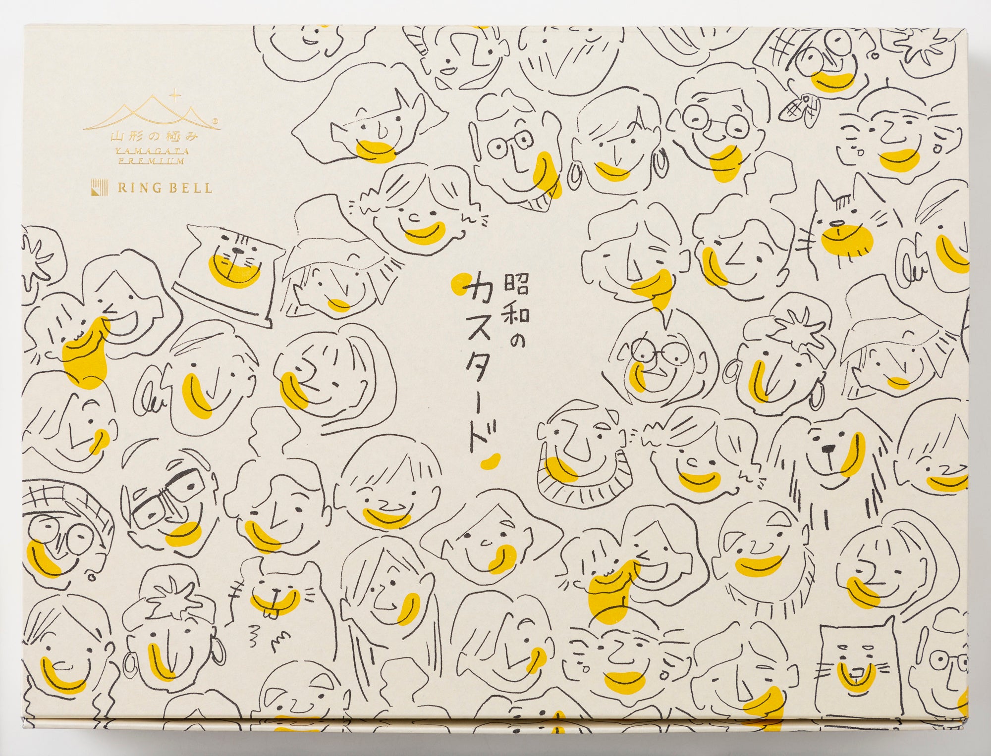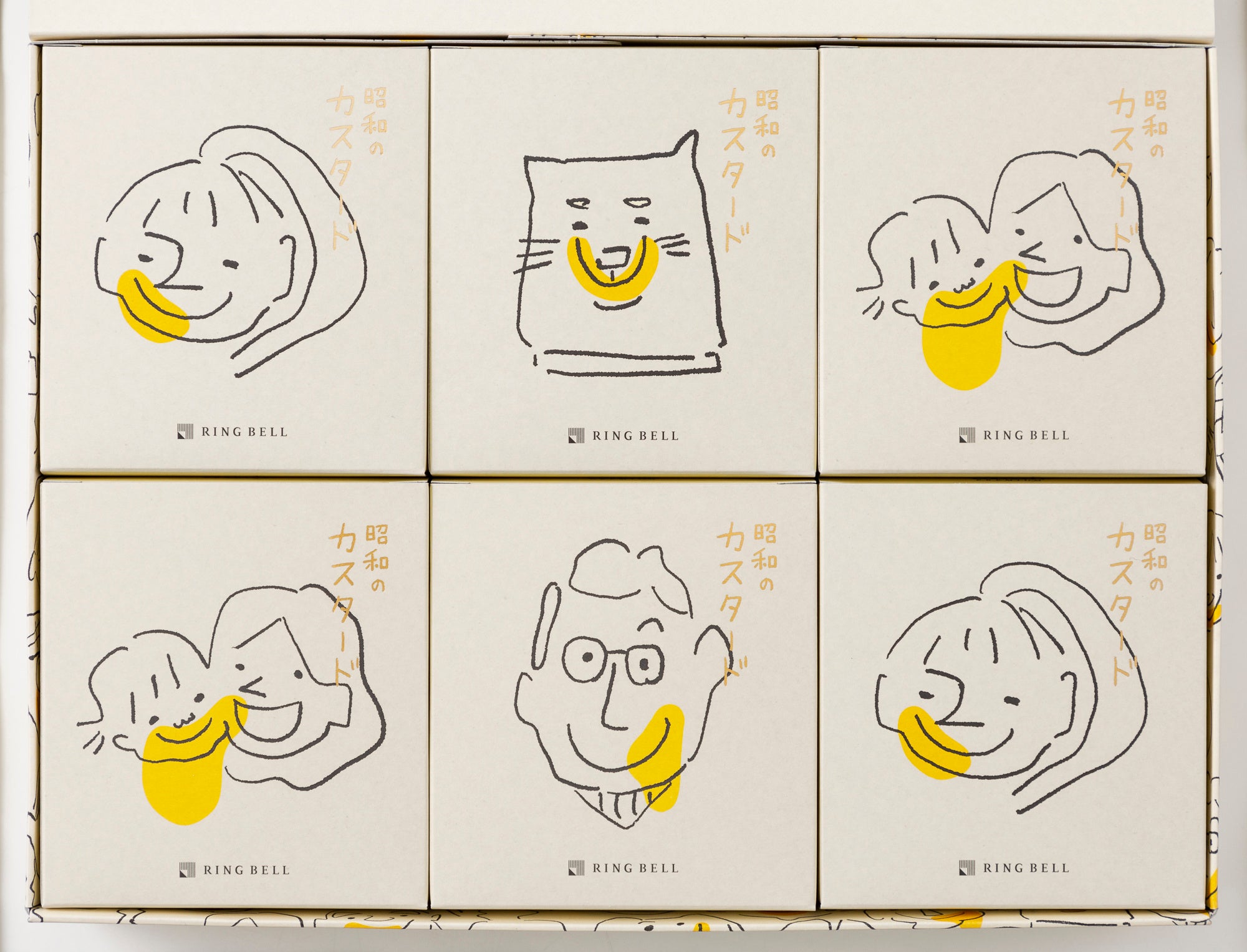 ギフトとしてふさわしいよう、様々な世代の方がみんなでカスタードケーキを食べているシーンをイメージしたデザインで、味だけでなくパッケージからも昔なつかしい味わいを感じていただけます。中の小箱には4種類の家族の顔が入っており、お渡し用にも楽しんでいただけるデザインです。