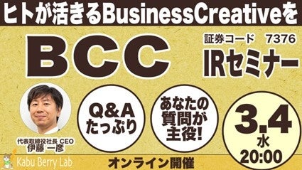 BCC株式会社(本社:大阪市中央区、代表取締役社長 CEO:伊藤 一彦、東証グロース上場:証券コード7376、以下当社)は、個人投資家向け「Kabu Berry Lab IRセミナー」(主催:株式会社殿中)に登壇します。本セミナーでは、代表取締役社長 CEOの伊藤が、2026年9月期第1四半期の決算概要を中心に、当社の事業概要や競争優位性、成長戦略についてご説明いたします。セミナーの後半には質疑応答の時間も設けておりますので、この機会にぜひ皆様のご参加を心よりお待ちしております。