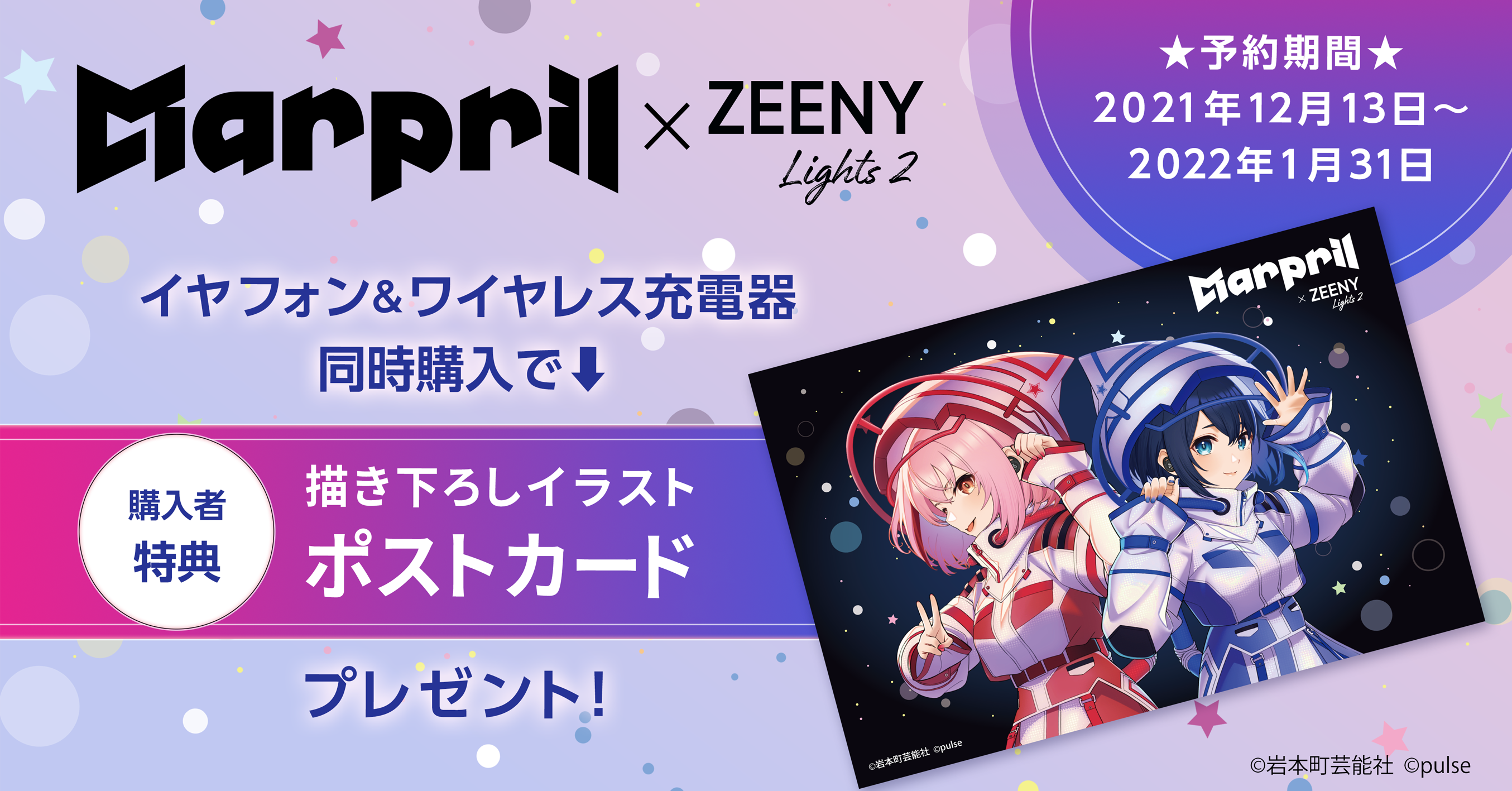 コラボレーションを記念して、「Marpril」オリジナルデザインのワイヤレスイヤフォンと、ワイヤレス充電器を完全受注商品として販売。いつもそばに2人がいるような操作音を搭載し、イヤフォンからしか聞くことができないシークレットボイスもお楽しみいただけます。