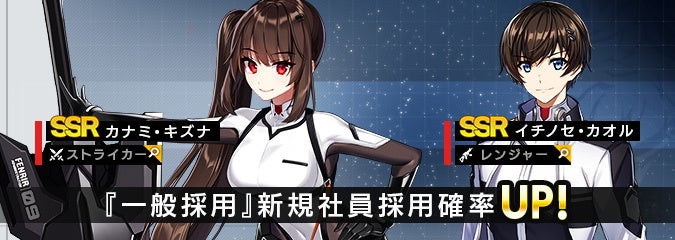 新SSR「カナミ・キズナ」「イチノセ・カオル」を実装、排出確率がアップするピックアップ採用(ガチャ)ならびに期間限定SSR覚醒「ヒルデ:タイプジークフリート」の機密採用、既存SSR 3キャラクターのピックアップ採用(ガチャ)をそれぞれ開始いたしました。