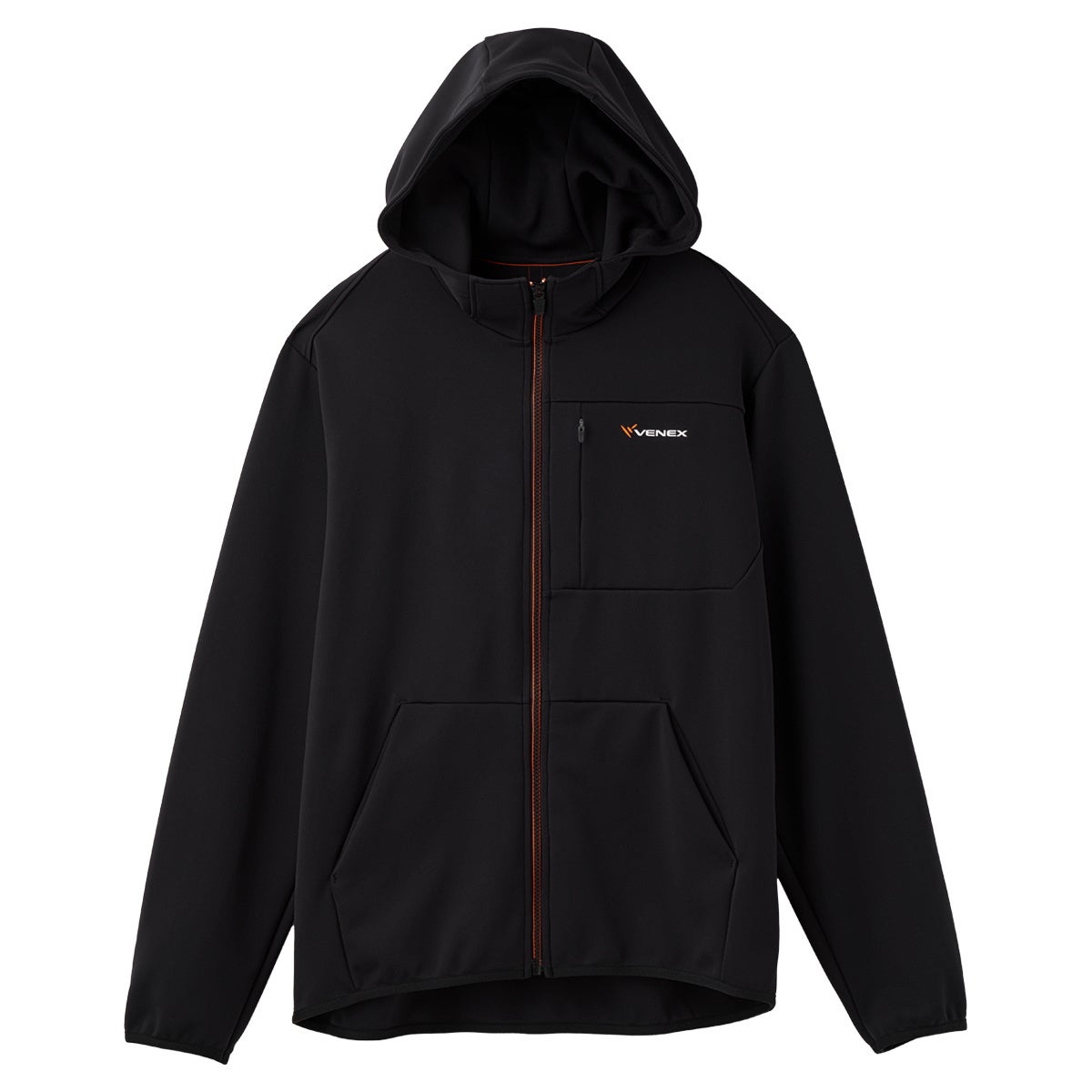 ファスナーテープとセンターバックのテープに採用したオレンジがアクセントとなりスマートな着こなしに。後ろ襟の内側には汗臭に対する消臭効果があるテープを施しています。移動時の利便性を考え抜き、フードや袖・胸ポケットを付けたジャケットです。