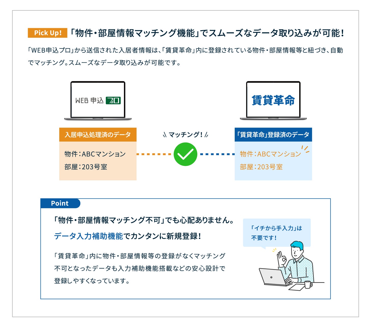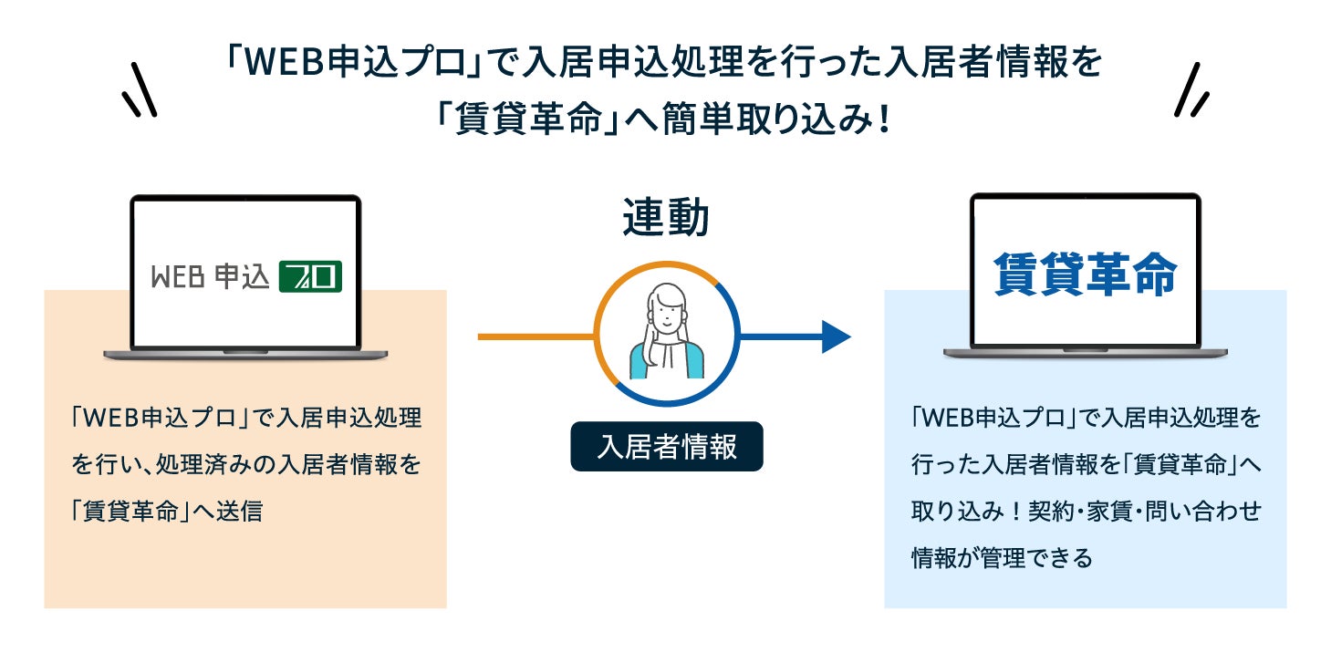 月間アクセス数3,500万PV※1の業界最大級のリアルタイム業者間流通サイト「リアプロ」にて賃貸管理会社も仲介会社も無料で利用できるWEB入居申請システム「WEB申込プロ」と、賃貸管理システム導入実績No1※2の賃貸管理システム「賃貸革命」が連携することで、「WEB申込プロ」を通じてデータ化された入居者情報を「賃貸革命」へ簡単に取り込むことができるようになります。両システムのシームレスなデータ連携によって、契約に関する不動産事業者の情報管理が一元化され、更なる業務効率化が可能となります。