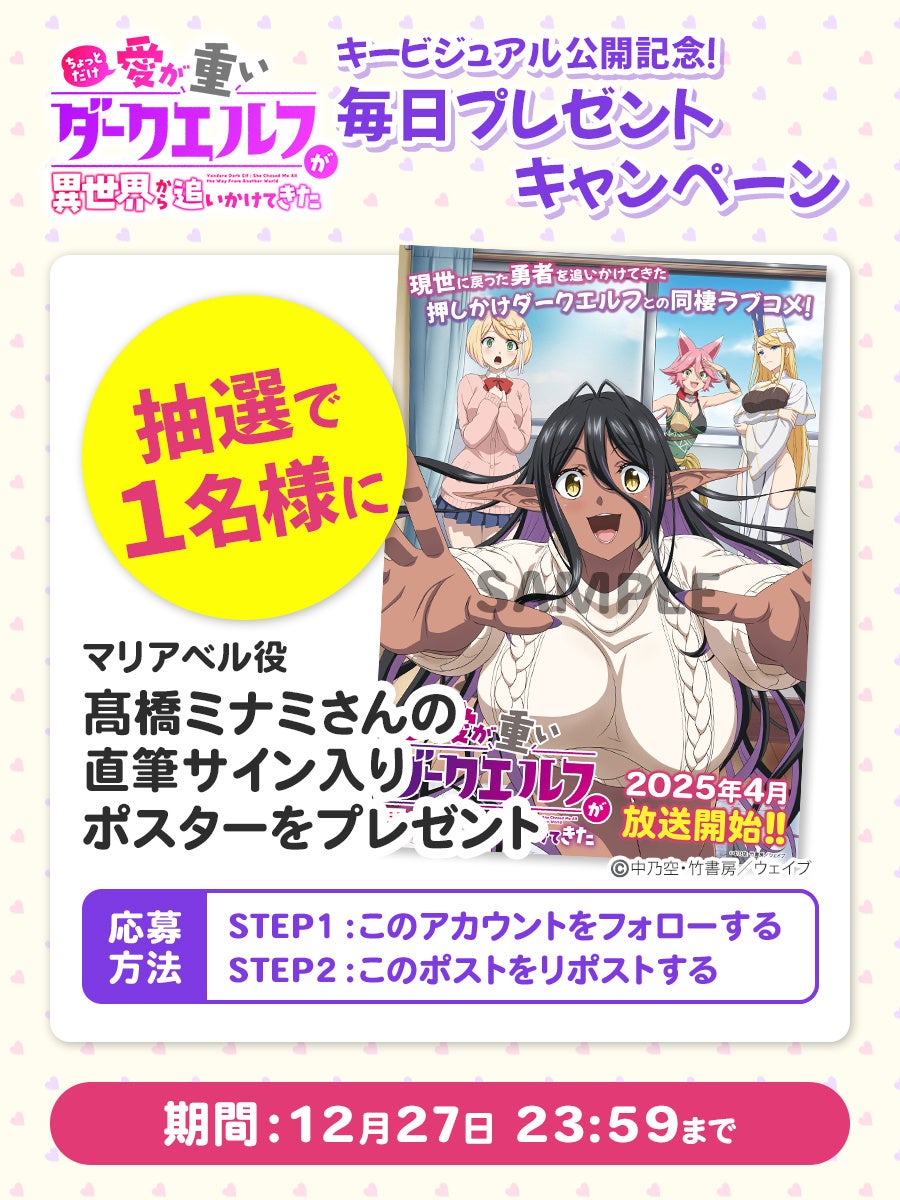 本日12月20日(金)、株式会社ウェイブ(本社:東京都豊島区、代表:関口航太)運営のアニメーションレーベル「デレギュラ」より2025年4月より放送予定の新TVアニメ『ちょっとだけ愛が重いダークエルフが異世界から追いかけてきた』(以下:愛重ダークエルフ)に関する新たな情報をお知らせします。
