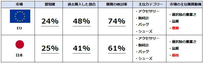 •高級品購入者の間で、越境ECを含めた、国境を越えた取引が一般的になってきている。 •日本からの購入に対しては、ヨーロッパと同等に高い期待を持たれていることが判明した。 •一方で、アジア市場全体に対する信頼度への偏見もあり、日本からの出品には「真贋保証」の付加価値が特に重要視されている。 •エコの観点からも、Refurbished(整備済み品)への注目が高まる。 |