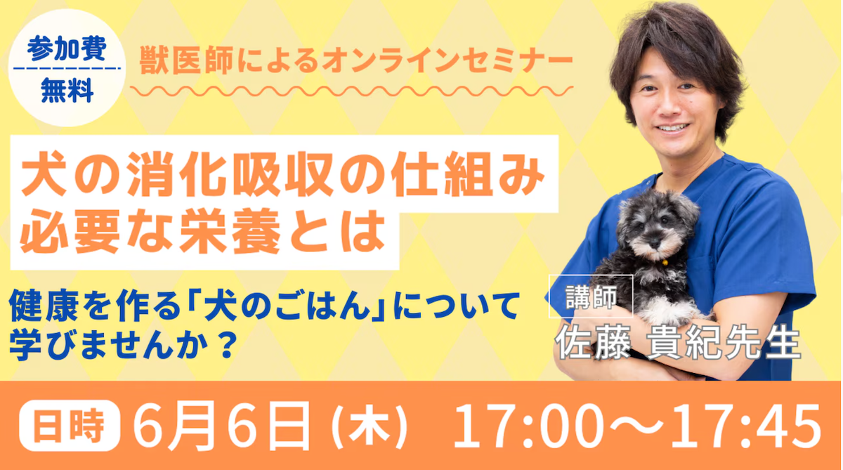サービス開始に伴い、獣医師・佐藤による無料オンラインセミナーを開催します。テーマは「犬の消化吸収と仕組み」。ペットの食育を推進するため、栄養学のセミナーを実施します。セミナー参加者には、ペトコトフーズの限定割引クーポンをプレゼントします。