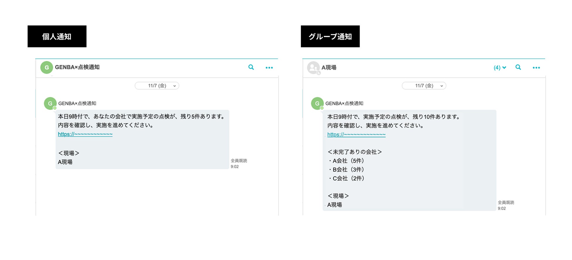 「GENBAx点検」から送られる、各協力会社への点検未完了リマインド・各種承認・現場内の点検実施状況などの通知を、見落とされがちなメールだけでなく「direct」のトーク上でも受け取ることができます。