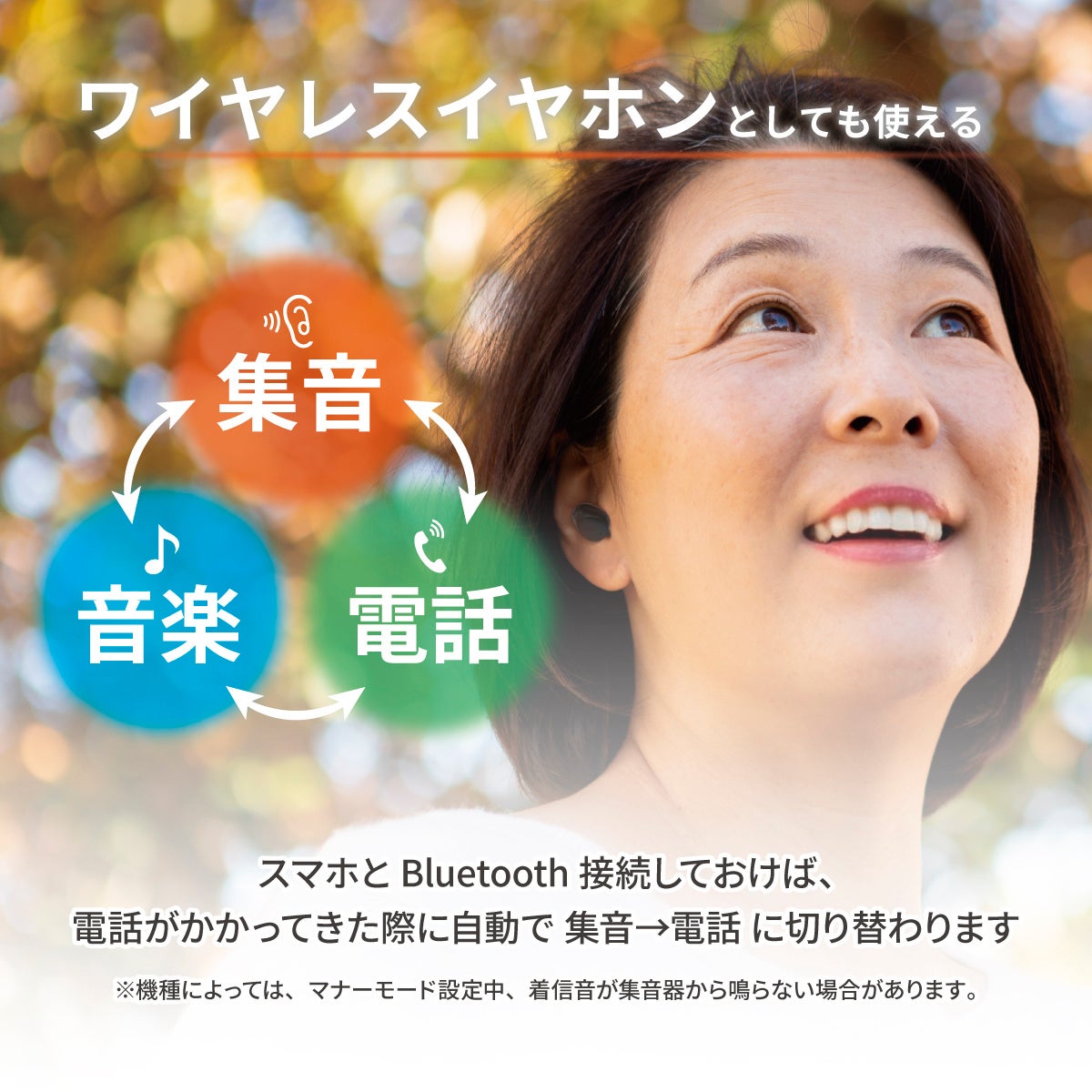 スマホとBluetooth接続することで、ワイヤレスイヤホンとして音楽再生、電話が可能。音ズレが少ないので、Youtubeなど動画視聴時の使用もおすすめです。集音↔音楽↔電話が自動で切り替わるので、「集音中に電話がかかってきて、そのまま集音器で通話する」というような使い方ができ、便利です。