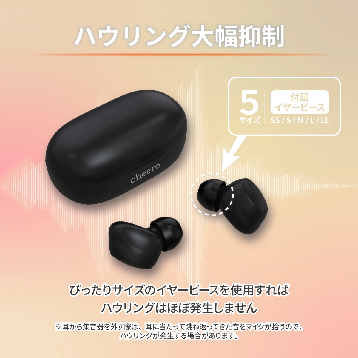 ケースから取り出して10秒間は集音しないので、耳に装着する際に発生するハウリングを回避。また、5サイズ(SS, S, M, L, LL)のイヤーピースが付属していますので、耳の穴にぴったりの大きさのイヤーピースを使用することで、さらにハウリングを抑えることが可能です。