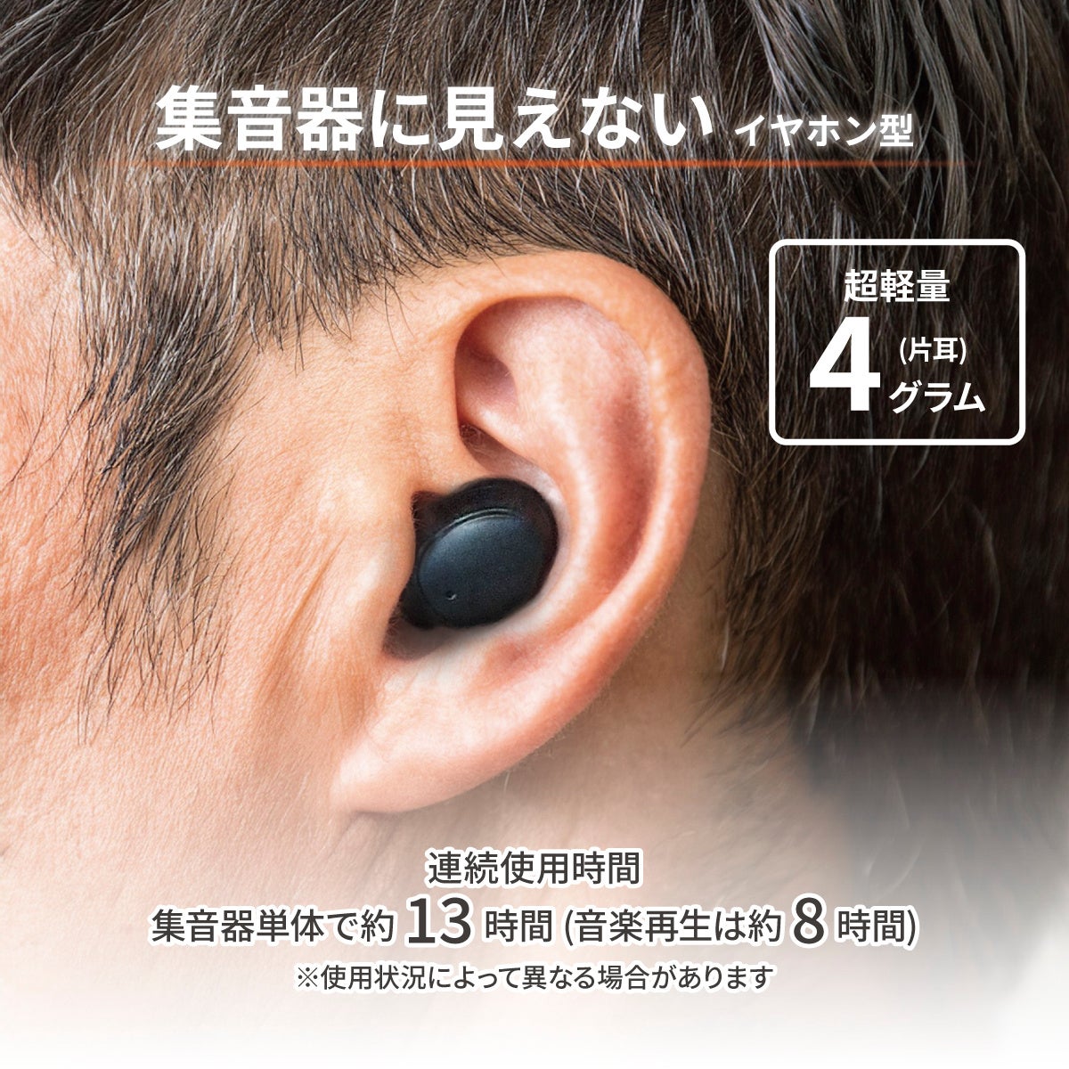 通常のイヤホンと同じ形状なので、周りに気付かれず集音器が使用できます。また、重量は片耳4gで着けていることを忘れるぐらい超軽量。充電式で電池交換不要、集音器単体で約13時間連続集音可能です。