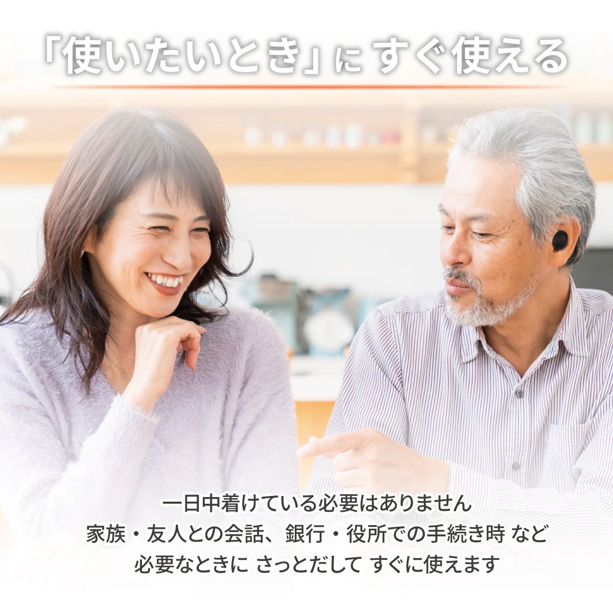 持ち運びに便利なコンパクトサイズで、ポケットに入れても邪魔になりません。また、充電ケースから取り出して耳に装着するだけで集音が開始します。補聴器のように一日中装着せず、使いたいときにさっと出して使うことができます。
