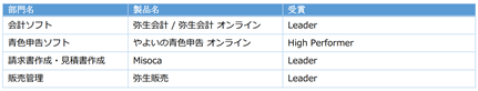 なお受賞した4部門のうち、「請求書作成・見積書作成」部門においては12期連続、「会計ソフト」部門では11期連続の「Leader」受賞となります。