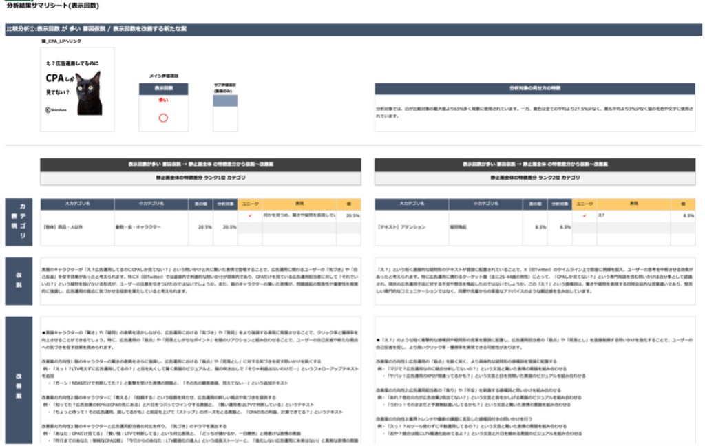 配信されたクリエイティブのパフォーマンス結果を元に、成功したクリエイティブ・失敗したクリエティブの「違い」が生まれた要素を、AIの技術を活用することで自動抽出。その抽出した要素を踏まえて、成功・失敗した理由を分析し、その分析内容及び改善案がテキストで抽出されます。