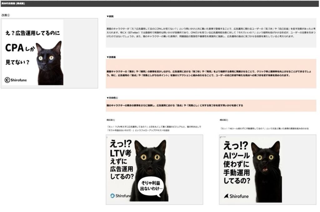 株式会社Shirofune(本社:東京都中央区、代表:菊池満長)では、広告運用自動化ツール「Shirofune」(シロフネ)のAIクリエイティブ改善ツール「I’m Creative(アイムクリエイティブ)」に、成功・失敗したクリエイティブの「何」が違ったのかを分析し、その分析内容をもとにした改善案、改善案を反映させた構成案を自動で出力することが可能になりました。