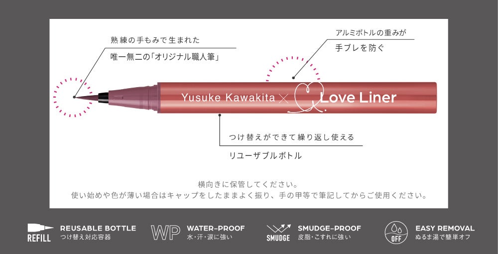 0.1mmの極細毛で細い線も太い線も自由自在。水・汗・涙に強いウォータープルーフ&皮脂・こすれに強いスマッジプルーフ仕様なのにぬるま湯で簡単にオフすることができるリキッドアイライナー。10種類の美容成分配合*でメイクするたびに美しい目元へ導きます。また、ボトルはリユーザブルボトル仕様なので、河北裕介コラボボトルを繰り返し使うことができます。