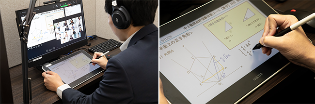 2021年7月に開講した「EIKOH LiNKSTUDY」では、Zoom等を通じて講師と生徒の双方向通信が行われる一方、画面上に表示したデジタル教材への書きこみに「Wacom One液晶ペンタブレット13」 を活用しています。グループ指導のLiNKSTUDY【グループ指導】最難関高校受験数学科責任者の河野知義氏は、「教材に手書きで線を引くことが多い数学担当者にとって、ペン先の感触で線の太さを自在に表現できるのはありがたいですね。また、ペンも充電の心配なく使え、何かあっても本体にあらかじめ格納されている替え芯にすぐ取り換えられるので安心して利用できています」と評価しています。