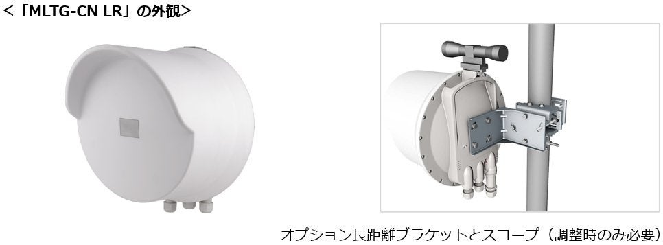 Terragraphに準拠した長距離クライアントノード。パラボラアンテナを搭載することで、長距離通信を可能にしたモデル。MLTG-360(分散ノード)との通信距離は700m。「MLTG-CN LR」対向で1kmの通信が可能です。