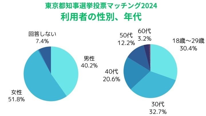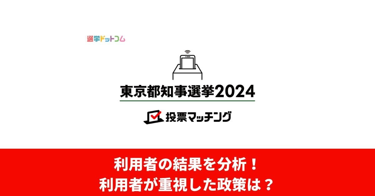 6月20日告示、7月7日投開票の東京都知事選挙で、選挙ドットコム(運営:イチニ株式会社 代表取締役 高畑卓)はTOKYO MXと共同で、利用者がどの候補者に近いかを調べられる「東京都知事選挙2024投票マッチング」を6月24日にリリースし、これまで約16万人を超える方にご利用いただきました。今回は利用状況を集計し、投票マッチング利用者の年代別の割合や、利用者が重視していた政策などを取りまとめ、結果を分析しました。
