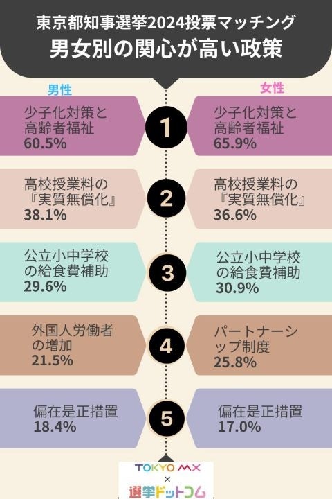 共通していたのは上位1~3番目の項目で「少子化対策と高齢者福祉」、「高校授業料の『実質無償化』」、「公立小中学校の給食費補助」でした。5位も男女とも「偏在是正措置」でした。