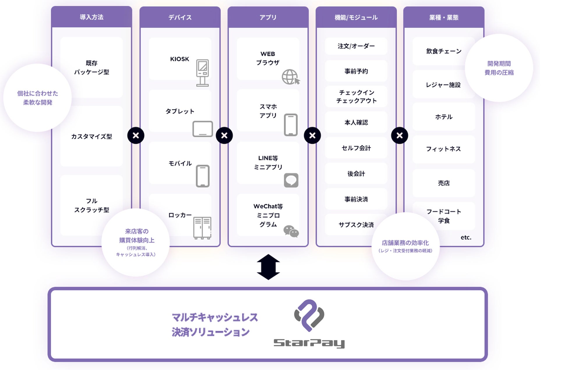「レジレスプラットフォーム」では、店舗の運営形態にあわせたカスタマイズ開発や、きめ細かいニーズを満たすためのフルスクラッチ開発も含めて、様々なアプローチでセルフ化ソリューションを実現します。各種ハード(ハンディ端末、KIOSK端末、タブレット端末など)とアプリケーション(Webアプリ、スマホアプリ、ミニアプリなど)を組み合わせることで、業態ごとに最適な券売機、セルフレジ機、セルフチェックアウト(精算)機、モバイルオーダーなどのサービスを構築します。また、店舗がすでに利用している既存システム(売上管理システムなど)とのデータ連携にも対応するほか、ネットスターズが提供するマルチキャッシュレス決済ソリューション「StarPay」をベースにしており、国内外50種類以上のキャッシュレス決済も利用可能です。