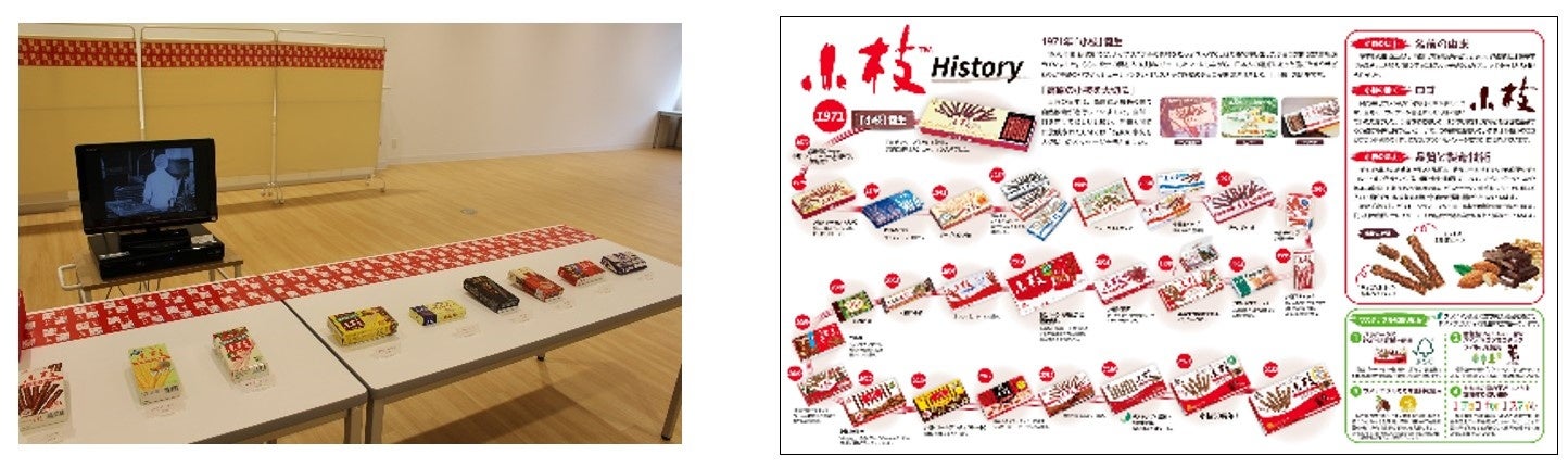 1971年の発売以来、鶴見工場で作り続けている「小枝」の歴史や、特徴的な商品のパッケージを展示します。