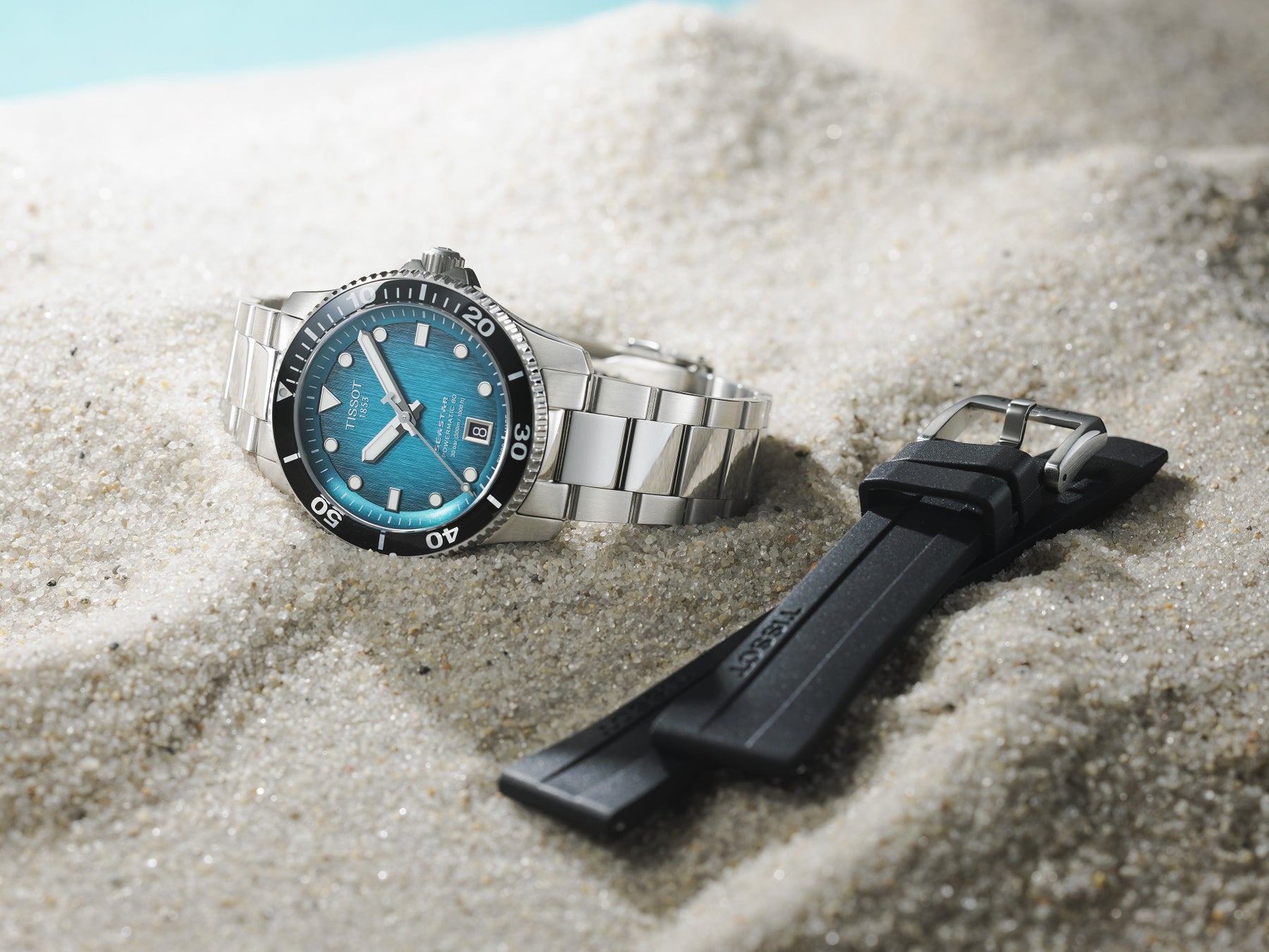 夏の腕元に映える防水時計「シースター」コレクションに加え、「PRX」「ル・ロックル」「ジェントルマン」といったティソを代表するコレクションの自動巻きモデルで、イージーチェンジャブル仕様のモデルが対象となります。