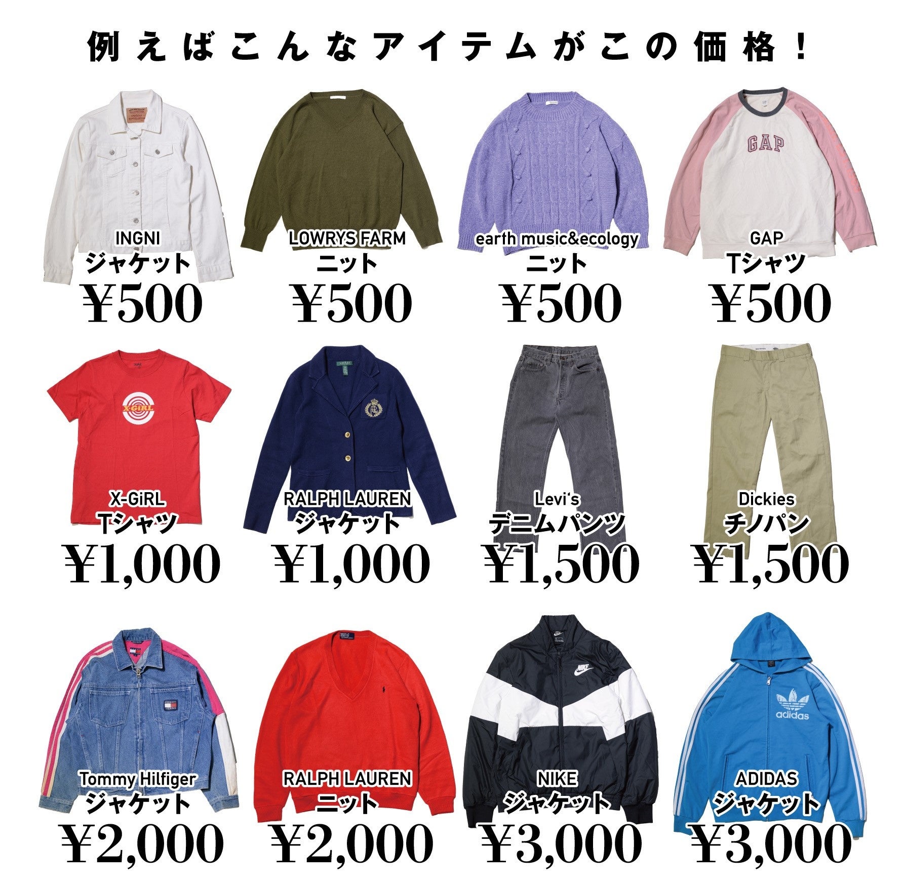 500円から3,000円のブランド古着やファッションアイテムを常時2,000点以上ご用意しております。定価が2万円程するアイテムもワンコインから購入することが可能です。流行りのアイテムからレトロな商品まで幅広くラインナップしており、低価格で様々なファッションコーディネートを組むことができます。仕入目的の業者の方はもちろん、通りがかりのお客様も、予約不要でお越しいただけます。ショッピングを楽しみながら、掘り出し物を探し、購入した商品を転売することも可能です。