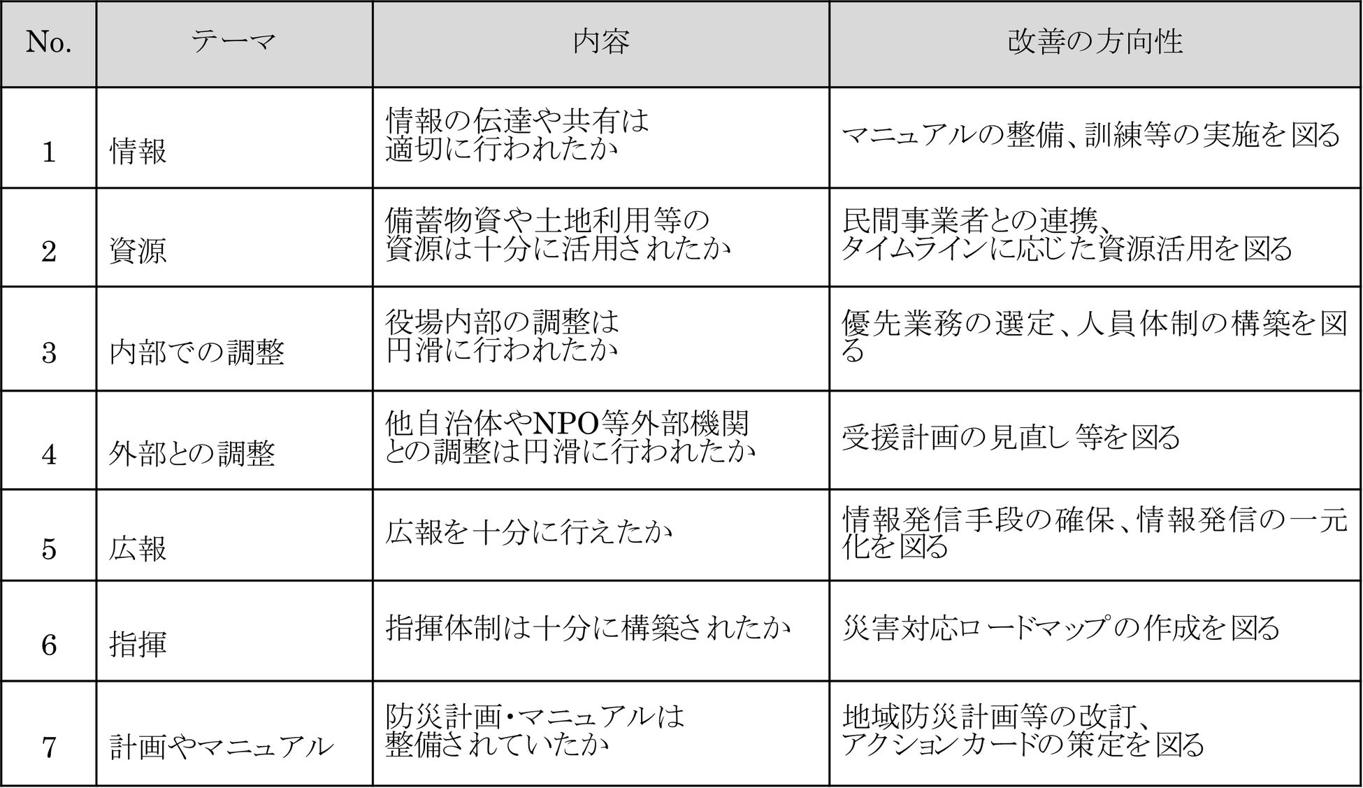 以上の調査から得た情報をもとに、東日本大震災後に実施されたこの共同研究と同様の自治体の災害対応検証例を参考に、「情報」、「資源」、「内部での調整」、「外部との調整」、「広報」、「指揮」、「計画やマニュアル」の7つの視点から能登町の災害対応の実施事項、課題、改善の方向性を整理しました。(下表)