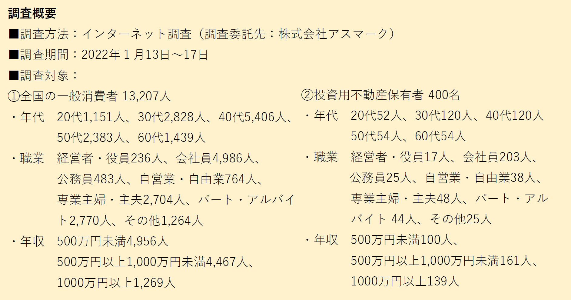 グローバル都市不動産研究所(以下、「当研究所」)では、全国の20代~60代の1万人以上を対象に、投資や不動産投資に対する興味・関心を尋ねる内容と、投資用不動産所有者400人に対して投資目的・投資意向を尋ねる調査を実施しました。