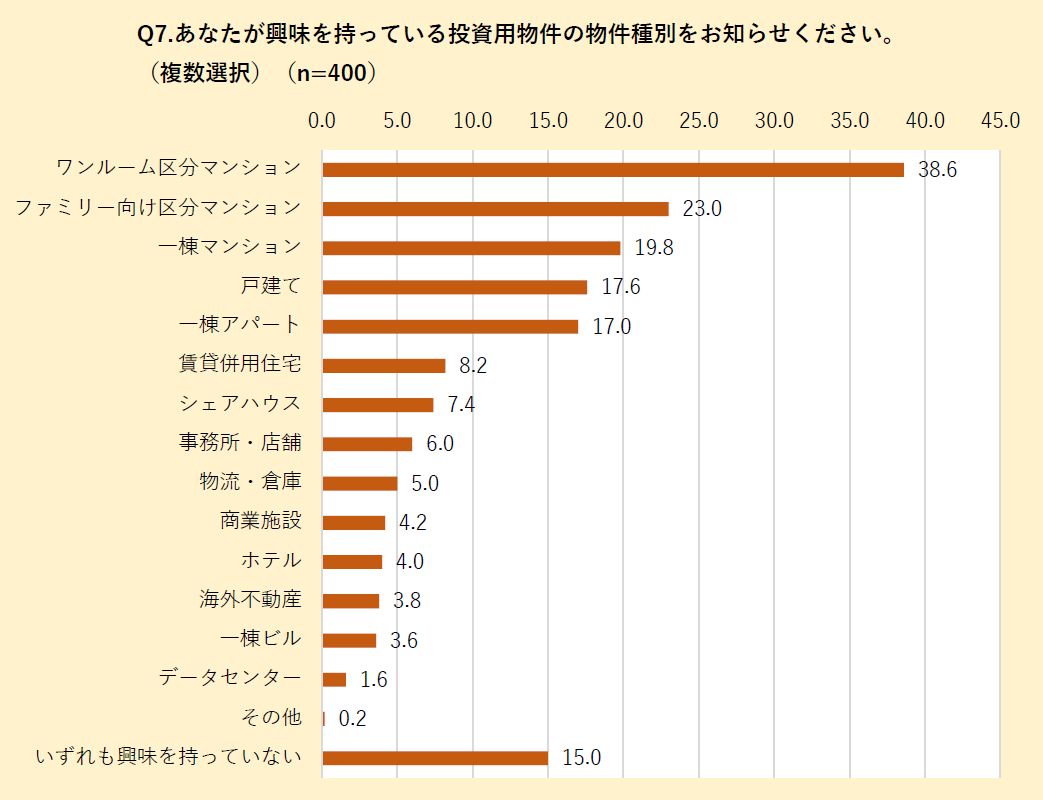 投資用不動産所有者に、興味を持っている投資用物件の種別を尋ねたところ、「ワンルーム区分マンション」がもっとも多く38.6%でした。これに「ファミリー向け区分マンション」「一棟マンション」「戸建て」が続いており、レジデンス物件が上位を占めています。