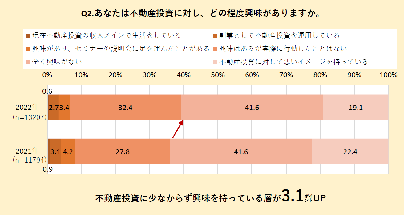 不動産投資に投資に対する行動や興味を尋ねたところ、「現在不動産投資の収入メインで生活をしている」(0.6%)、「副業として不倒産投資を運用している」(2.7%)、「興味があり、セミナーや説明会に足を運んだことがある」(3.4%)、「興味はあるが実際に行動したいことはない」(32.4%)で、少なからず興味を持っている層は39.1%(前年36.0%)でした。