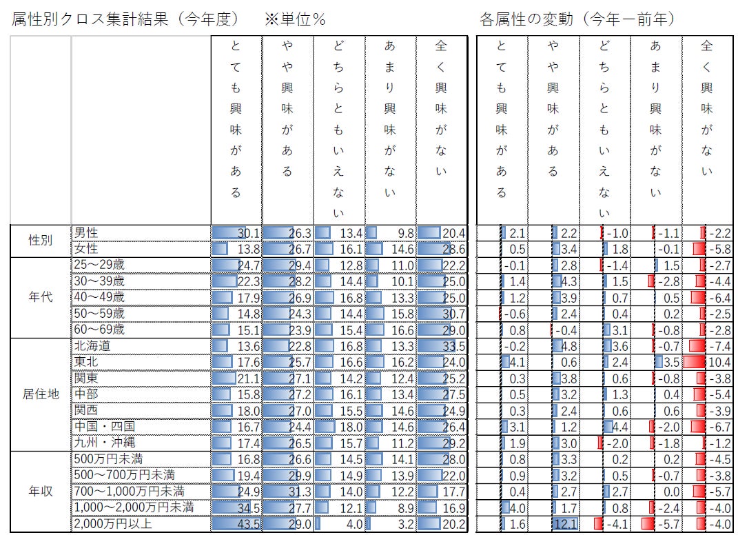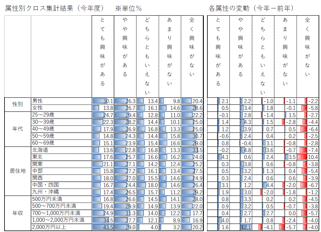 属性別に経年比較すると、性別では女性、年代では若年層で不動産投資に対する興味が増しているように見えます。女性や若年世代が「現物資産」に魅力を感じているのかもしれません。
