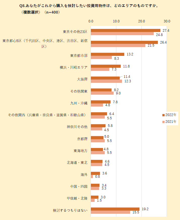 投資エリアとしては依然として都区部を中心に首都圏に強い関心があり、とりわけ20代の若者は「東京都心5区」に対する興味が増しています。そのなかで、大阪府、その他関東、京都府、東海地方では前年よりも少し下がりました。