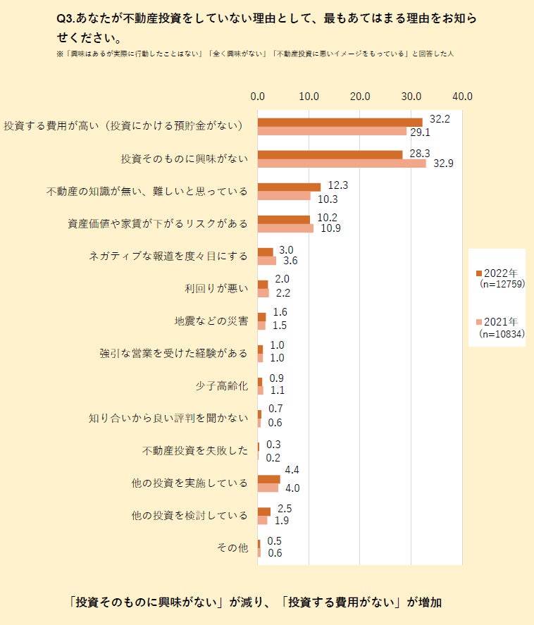 この結果、「投資する費用が高い(投資にかける預貯金がない)」が32.2%でもっとも高く、前年1位だった「投資そのものに興味がない」(28.3%)を上回りました。