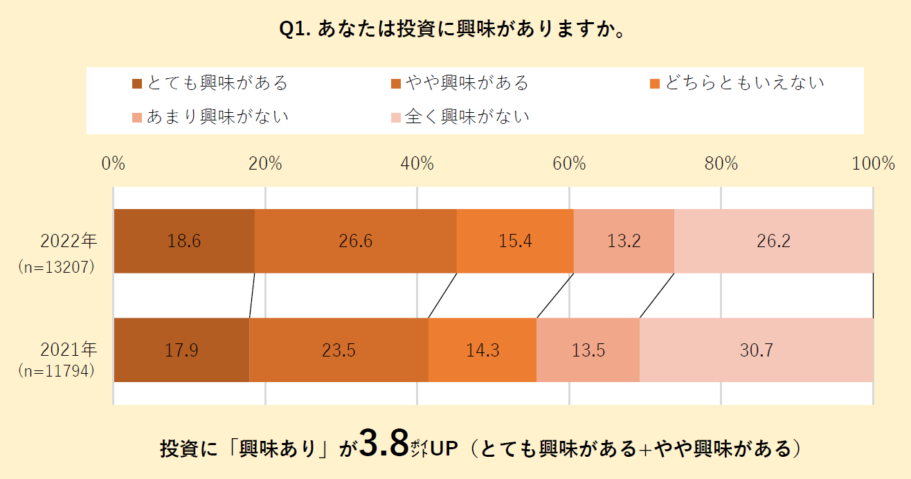 投資に対する興味を尋ねたところ、「とても興味がある」(18.6%)、「やや興味がある」(26.6%)をあわせた45.2%が投資に「興味がある」と回答していました。「興味がある」は、昨年の41.4%から45.2%に3.8㌽増えています。