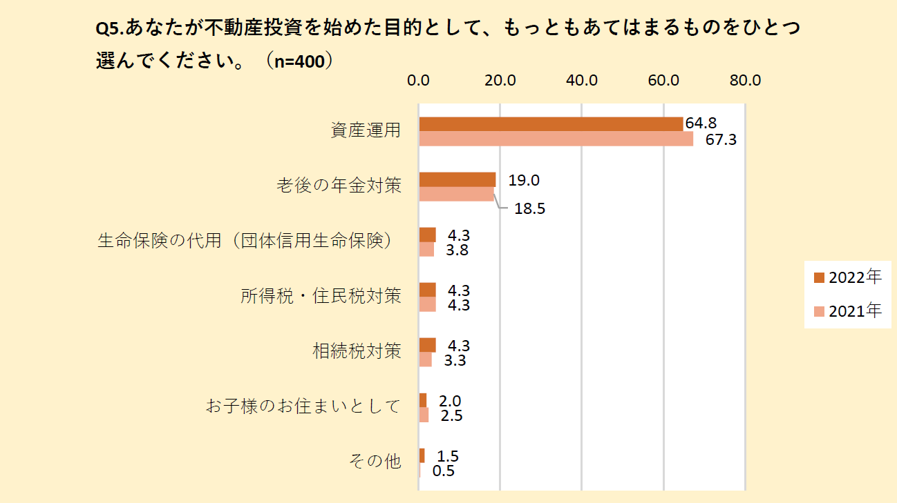投資用不動産所有者に、不動産投資をはじめた目的(もっともあてはまるもの)を尋ねたところ、「資産運用」が64.8%で大半を占めていました。「資産運用」は前年の67.3%から2.5㌽減少しています。「老後の年金対策」が19.0%で続いており、これは前年より0.5㌽上昇しました。属性別にみると、20代~30代は「資産運用」が大半を占めるものの、経年では「老後の年金対策」や「所得税・住民税対策」が増えています。将来不安が強いことと、少しでも節税に繋げたいという意識が若い世代で拡がっている可能性が考えられます。