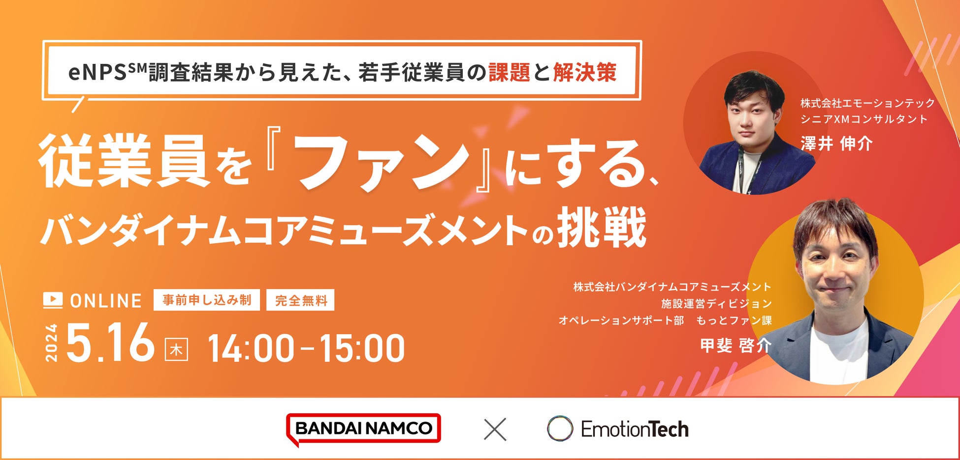 株式会社エモーションテック(東京都港区:代表取締役 今西良光、以下エモーションテック)は、株式会社バンダイナムコアミューズメント 施設運営ディビジョンより甲斐 啓介氏をお招きし、2024年5月16日(木) 14:00より、従業員エンゲージメント向上セミナーを実施いたします。