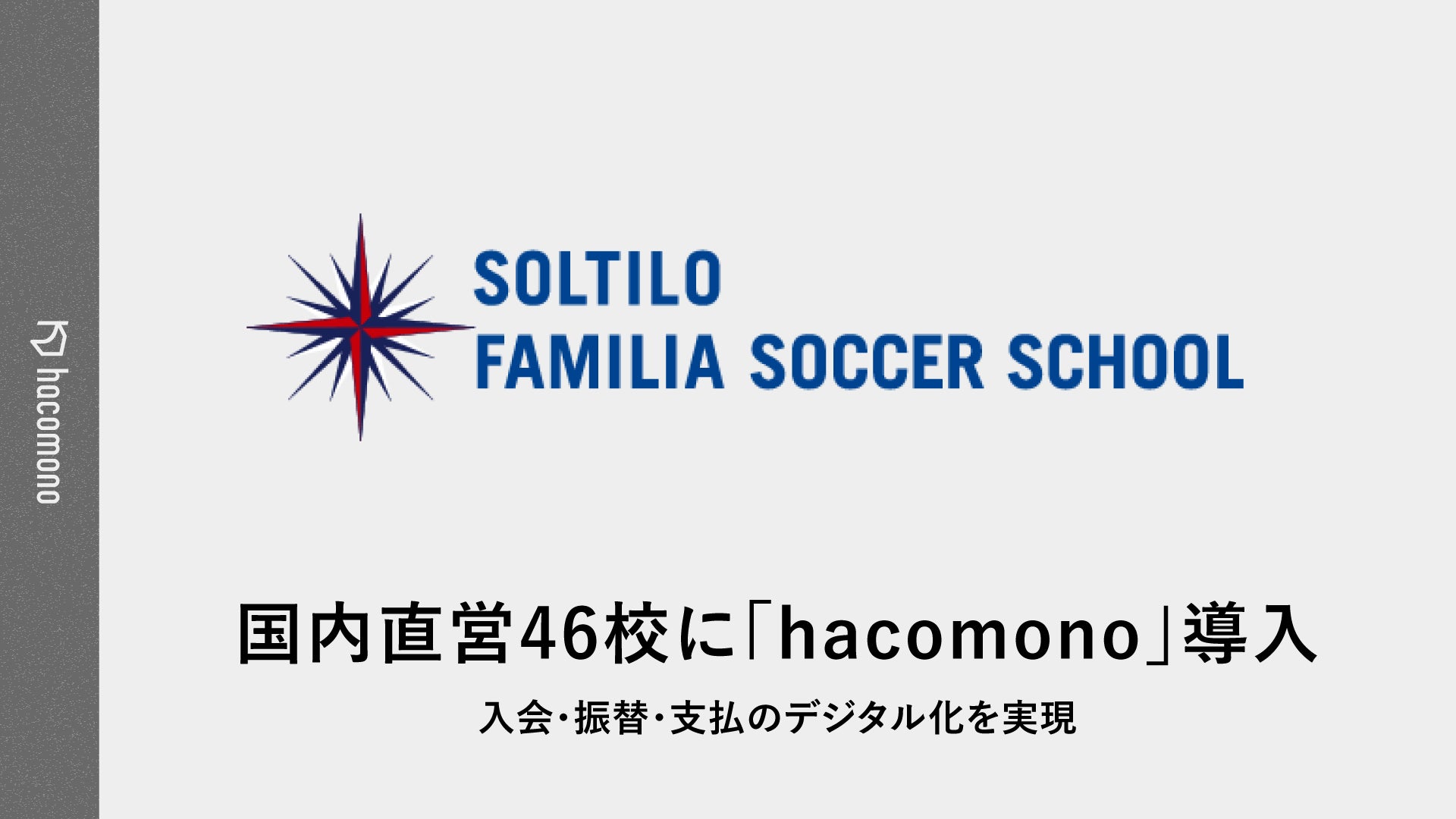 「ウェルネス産業を、新次元へ。」をミッションに掲げる株式会社hacomono(本社:東京都渋谷区、代表取締役CEO:蓮田 健一、以下、hacomono)は、SOLTILO株式会社(大阪府吹田市、代表取締役:本田 圭佑)が運営する「SOLTILO FAMILIA SOCCER SCHOOL」のスクール運営システムとして採用されたことをお知らせいたします。