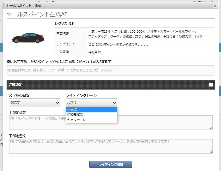文字数は50文字〜500文字の間で5段階で調整できます。ライティングトーンは「元気に」「明瞭簡潔に」「キャッチーに」の3パターンから選択可能で、それぞれで生成されるセールスコメントのトーンが異なります。また、上部と下部に定型文を設定することができ、中古車販売店ごとの独自性はそのままにAIにセールスコメントを生成させることも可能となっております。
