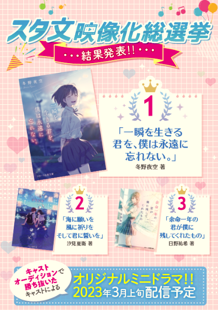 そしてこのたび、約1,500票の読者投票の結果、『一瞬を生きる君を、僕は永遠に忘れない。』(冬野夜空)が「映像化してほしいスタ文作品」の第1位に選ばれ、オリジナルミニドラマ化が決定いたしました。