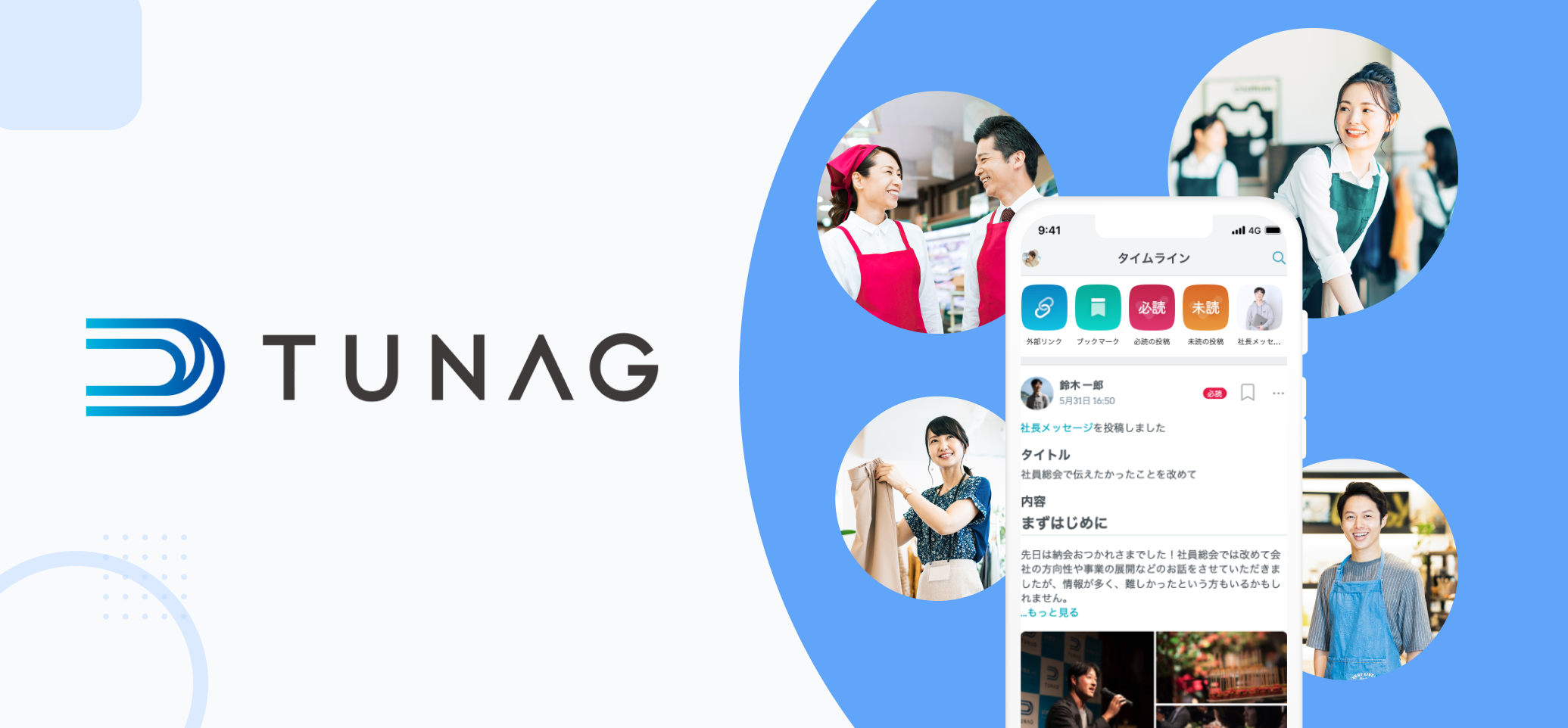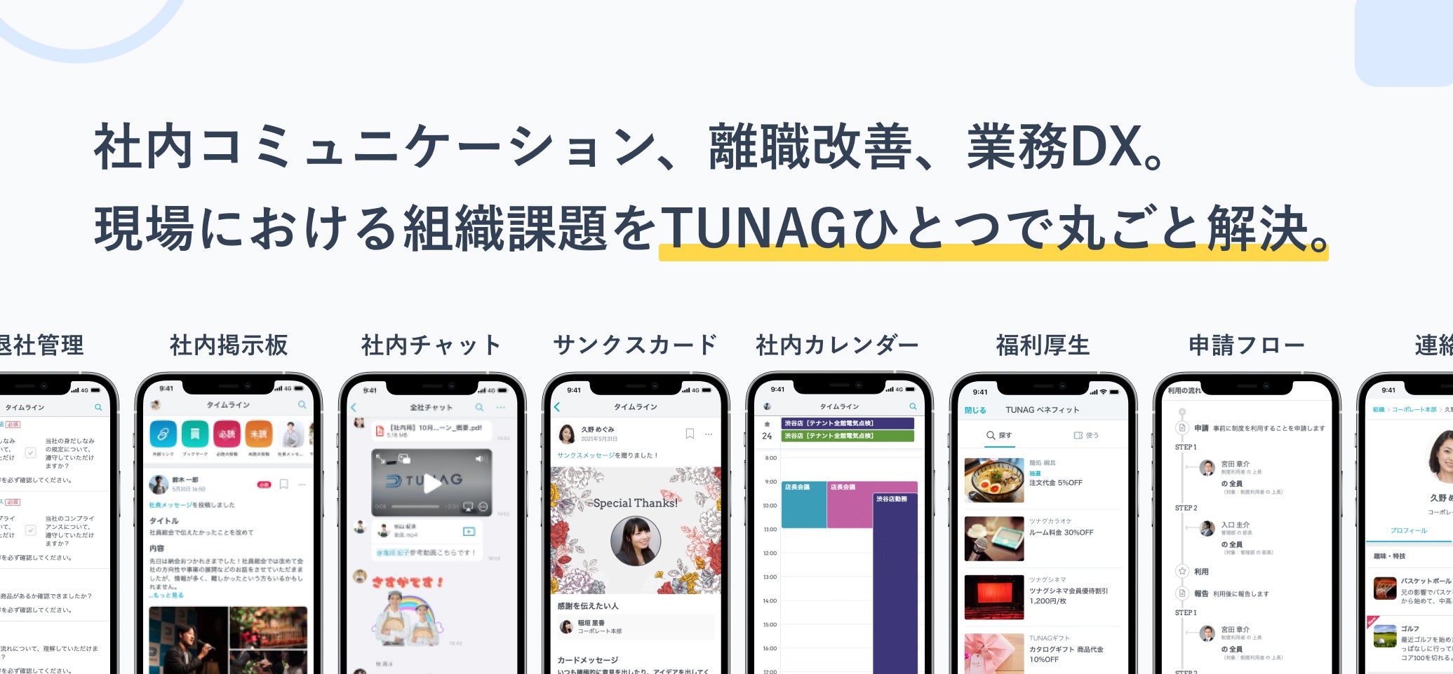 TUNAGは、日本の労働人口の50%以上と言われるノンデスクワーカーの方々の働き方を変革し、一人ひとりの働きがいを向上させるとともに、組織の業務効率や生産性、従業員エンゲージメントを高めるサービスを目指してまいります。