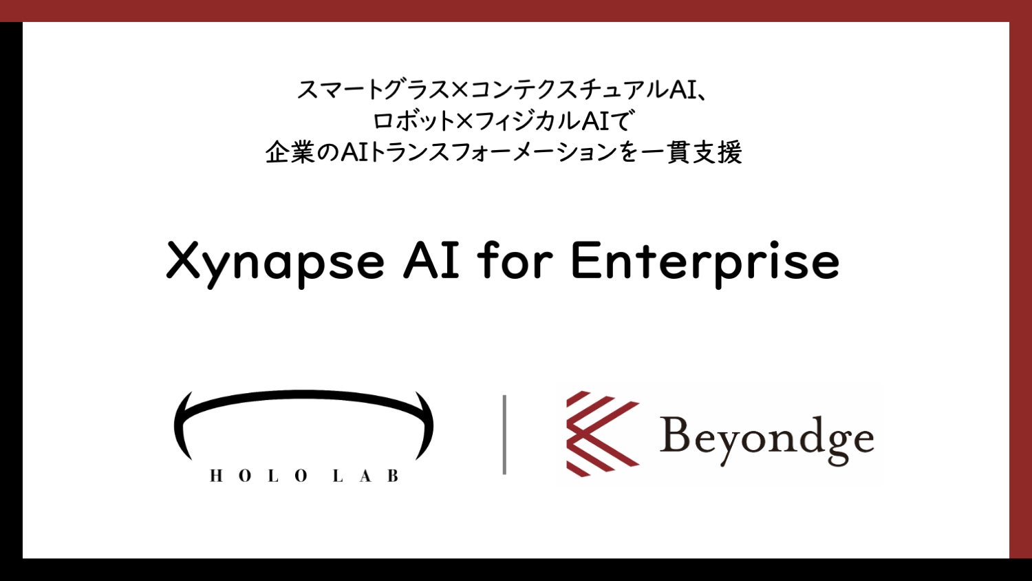 株式会社ホロラボ(本社:東京都品川区、代表取締役CEO:中村 薫、以下ホロラボ)とBeyondge株式会社(本社:東京都渋谷区、代表取締役CEO:野上 隆徳、以下Beyondge)は、スマートグラスとコンテクスチュアルAI、ロボットとフィジカルAIを活用することで、企業の全社的なAIトランスフォーメーション(AX)を一貫して支援することを目的に業務提携を締結し、ホロラボの「Xynapse AI (シナプス エーアイ)」をベースとした共同サービス「Xynapse AI for Enterprise」を2025年12月1日から提供開始します。