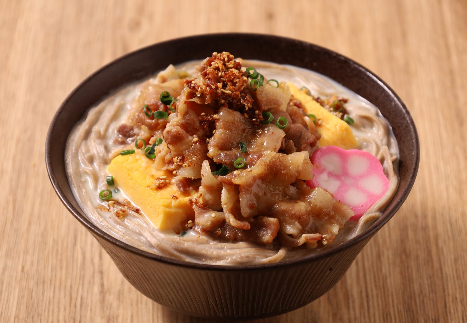 冷たいそばにあま旨いすき焼き味の豚肉と卵焼きをのせ、だしの香り豊かな白だしと無調整豆乳を合わせた絶品つゆをかけていただきます。