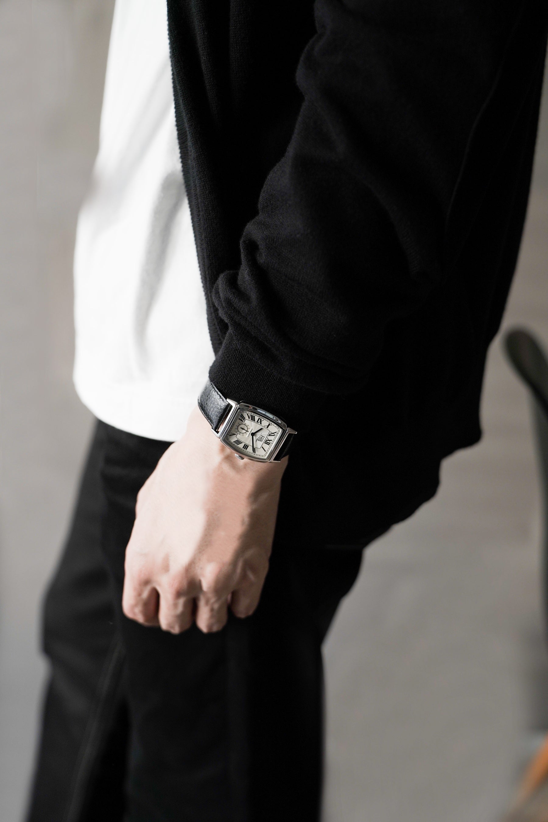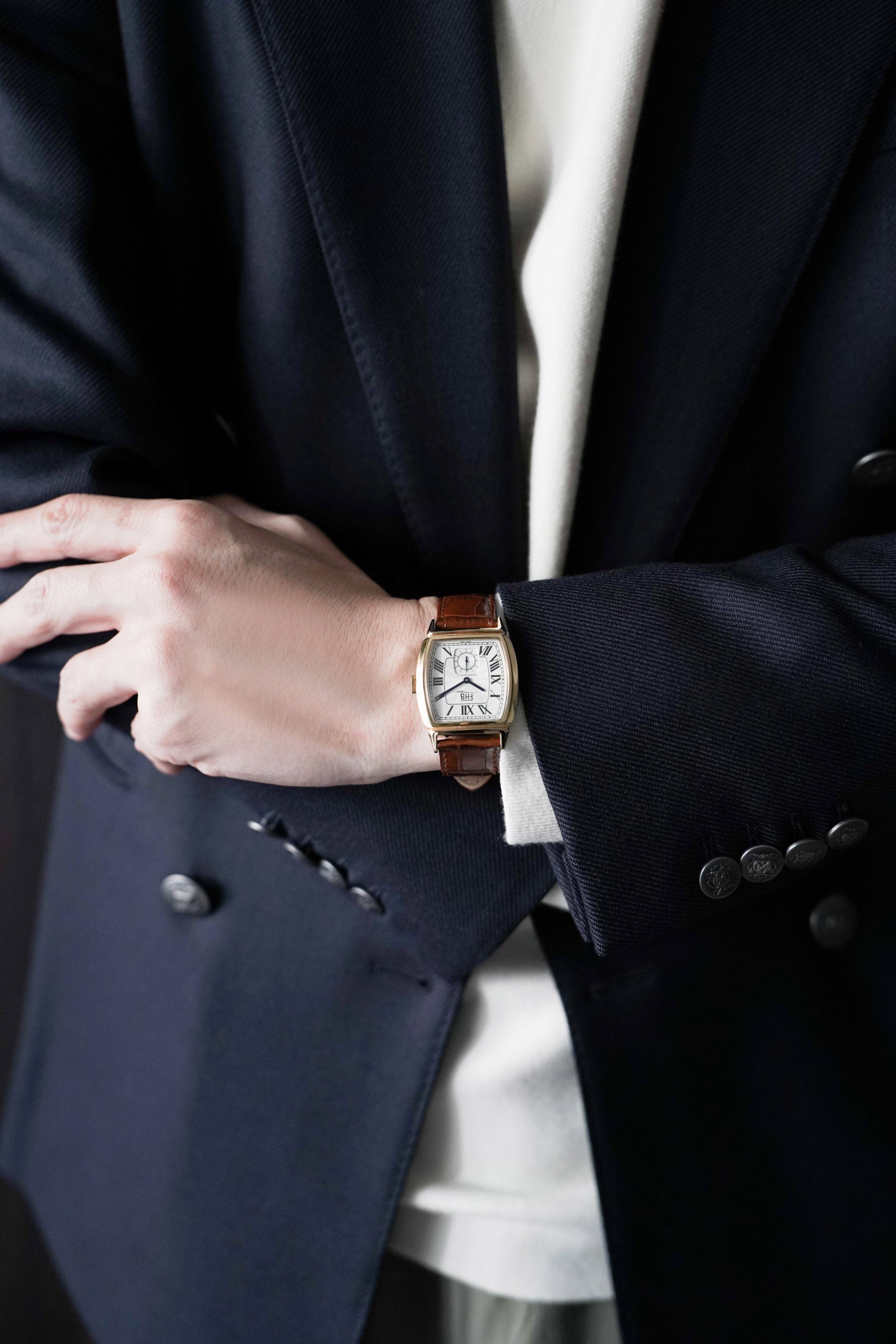 アール・デコスタイルのトノー型ケースをベースにした美しいフォルムが特徴のLEO F903シリーズに新たな息吹をもたらすのは、ローマ数字のインデックスを採用し、ギョーシェ模様を取り入れ、クラシックな青いリーフ針がアクセントの2型。シルバーケースにシボ加工を施した黒いレザーストラップの組み合わせがスタイリッシュなモデル 。そして、イエローゴールドケースに型押しのこげ茶色レザーストラップを組み合わせた大人の余裕を漂わせるモデルがラインナップ。レイルウェイ目盛りと6時位置のスモールセコンドは既存のF903シリーズと同様に配置し、 クラシカルな雰囲気を醸し出しています。文字盤にはブランドオーナーのHUBER氏がデザインを考える際 、 デザイン画の下に書いたデザインコードが記されています。さらに、時計のケースには全てシリアルナンバーが刻印されています。なお、シリーズ名のLEO(レオ)は、「勇敢な人」を意味しており、味わい深い時計に仕上がっています。