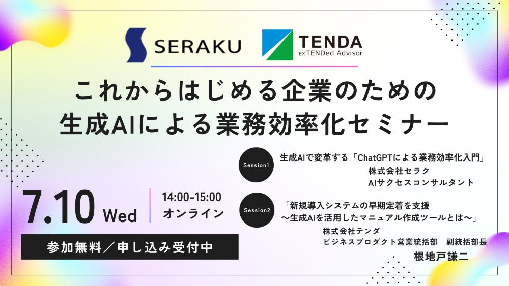 マニュアルトータルソリューションを提供する株式会社テンダ(本社/東京都渋谷区、代表取締役会長CEO/小林 謙、以下「テンダ」)は、株式会社セラク(本社/東京都港区、代表取締役/宮崎 龍己、以下「セラク」)と、2024年7月10日(水)に「これからはじめる企業のための生成AIによる業務効率化セミナー」と題し、共催ウェビナー(事前登録制・参加無料)を開催いたします。