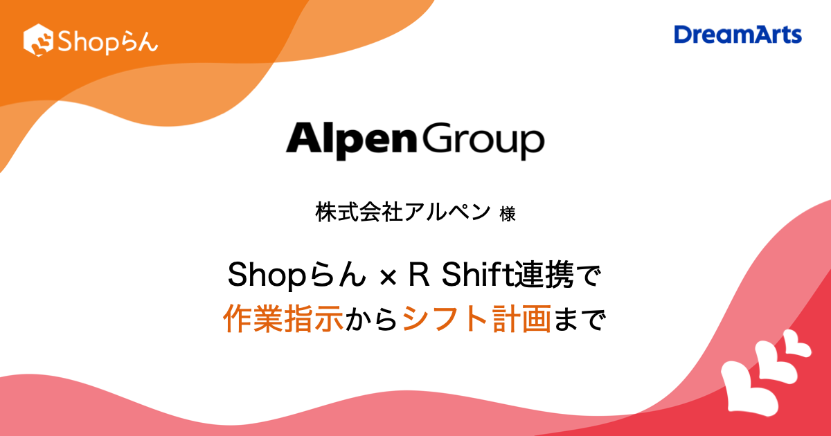 「デジタルの民主化(※1)」のリーディングカンパニー 株式会社ドリーム・アーツ(東京本社:東京都渋谷区、広島本社:広島県広島市、代表取締役社長:山本 孝昭、以下 ドリーム・アーツ)とオーエムネットワーク株式会社(本社:新潟市中央区、代表者:大野 勝、以下 オーエムネットワーク)は、このたび株式会社アルペン(本社:愛知県名古屋市、代表取締役社長:水野 敦之、以下 アルペン)がドリーム・アーツの提供する多店舗オペレーション改革を支援するクラウドサービス「Shopらん(R)(ショップラン)」とオーエムネットワークの提供するシフト管理システム「R-Shift(アールシフト)」の自動連携を2022年1月より利用開始し、3月より全店での本格利用を開始したことを発表します。 8月には本連携について詳しく紹介するセミナーを開催予定です。