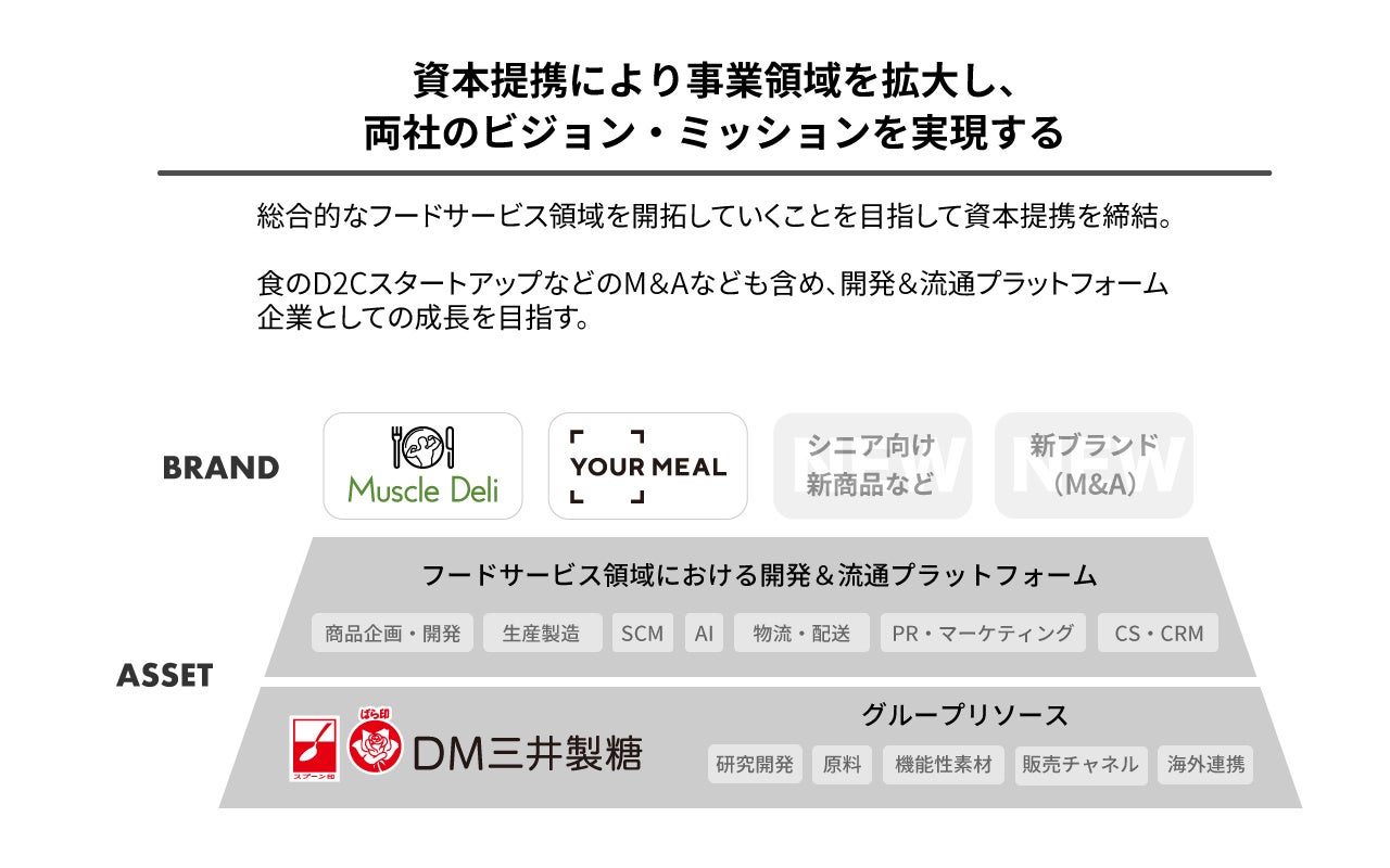 マッスルデリから引き継いだこれらの指標は、DM三井製糖の掲げる“Nutrition By Life Stage”のコンセプトとも共通しております。若年層からシニア層までそれぞれの世代に合った形で商品とサービスを提供し、“人と社会の 幸せのちからになる”ことの実現に近づけるべく、総合的なフードサービス領域における開発&流通プラットフォーム企業としての成長を目指していきます。