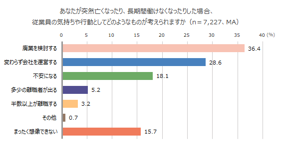 中小企業経営者7,227名に、もし経営者ご本人が突然亡くなったり、長期間働けなくなったりした場合、従業員の気持ちや行動としてどのようなものが考えられるか聞いたところ、最も多かったのが「廃業を検討する」(36.4%)だった一方で、2番目に多い回答が「変わらず会社を運営する」(28.6%)という結果になりました。