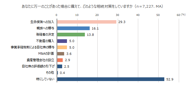 中小企業経営者7,227名に、万一に備えてどのような相続対策をしているか聞いたところ、52.9%が「特にしていない」と回答しました。相続対策をしている場合は、「生命保険への加入」(29.3%)、「親族への贈与」(16.1%)、「後継者の決定」(13.8%)が多い結果となりました。